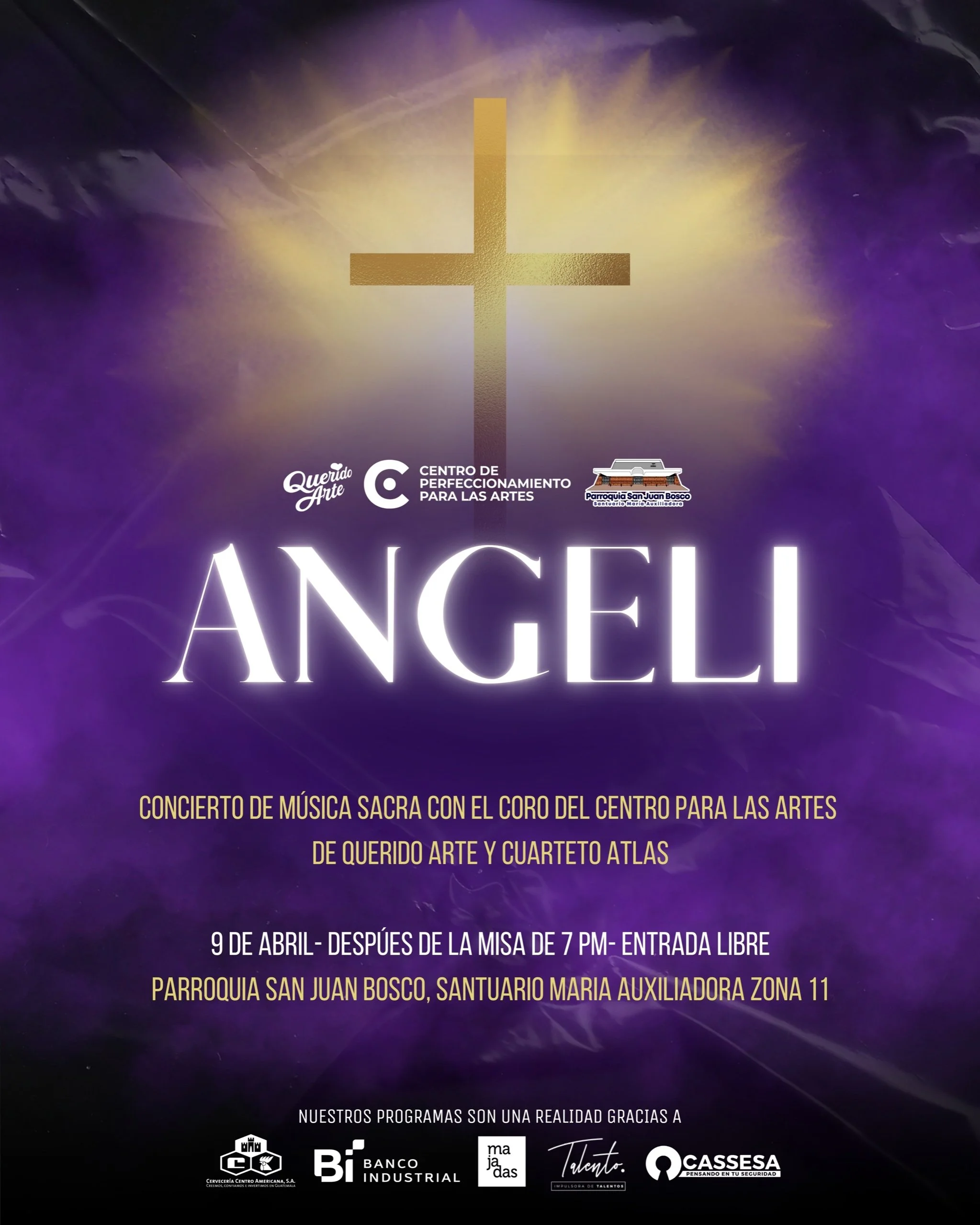 ANGELI: Música sacra con el Coro del Centro para las Artes y Cuarteto Atlas miércoles, 9 de abril de 2025 7:10 p. m. 8:10 p. m. Parroquia Maria Auxiliadora Zona 11 Guatemala (mapa) Google Calendar ICS ANGELI: Música Sacra con el Coro del Centro para las Artes y Cuarteto Atlas. Parroquia San Juan Bosco - Santuario Maria Auxiliadora Zona 11. Entrada Libre