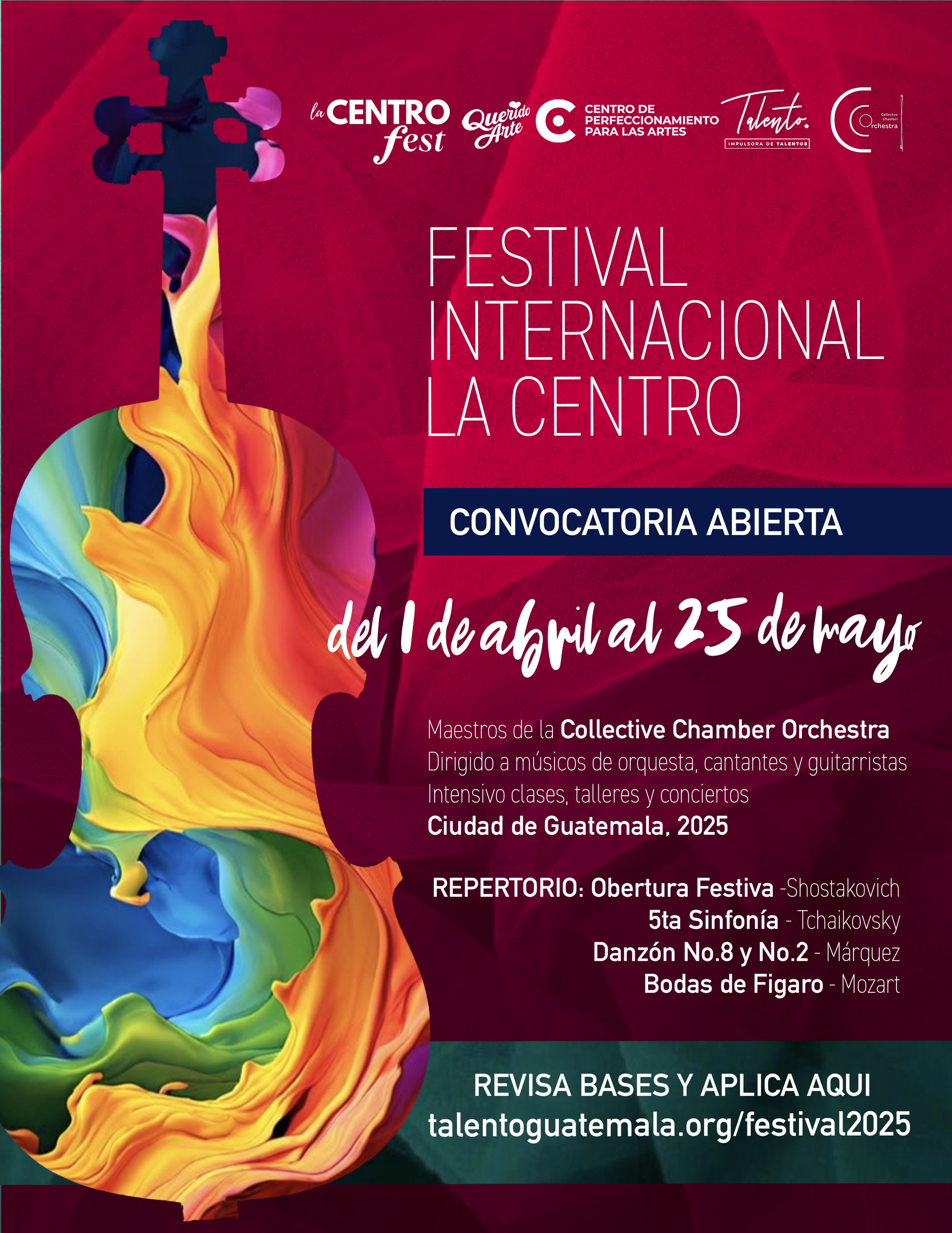 Forma parte del FILC (Festival Internacional La Centro) en donde podrás aprender de maestros extranjeros para todos los instrumentos, técnica de canto lírico y guitarra clásica en una semana de aprendizaje, conciertos, talleres, repertorio de alto rendimiento y crecimiento. Abierto a músicos de Guatemala y de todos los países que nos puedan acompañar. Conoce más detalles de cómo aplicar en el siguiente apartado. ¡Te esperamos!